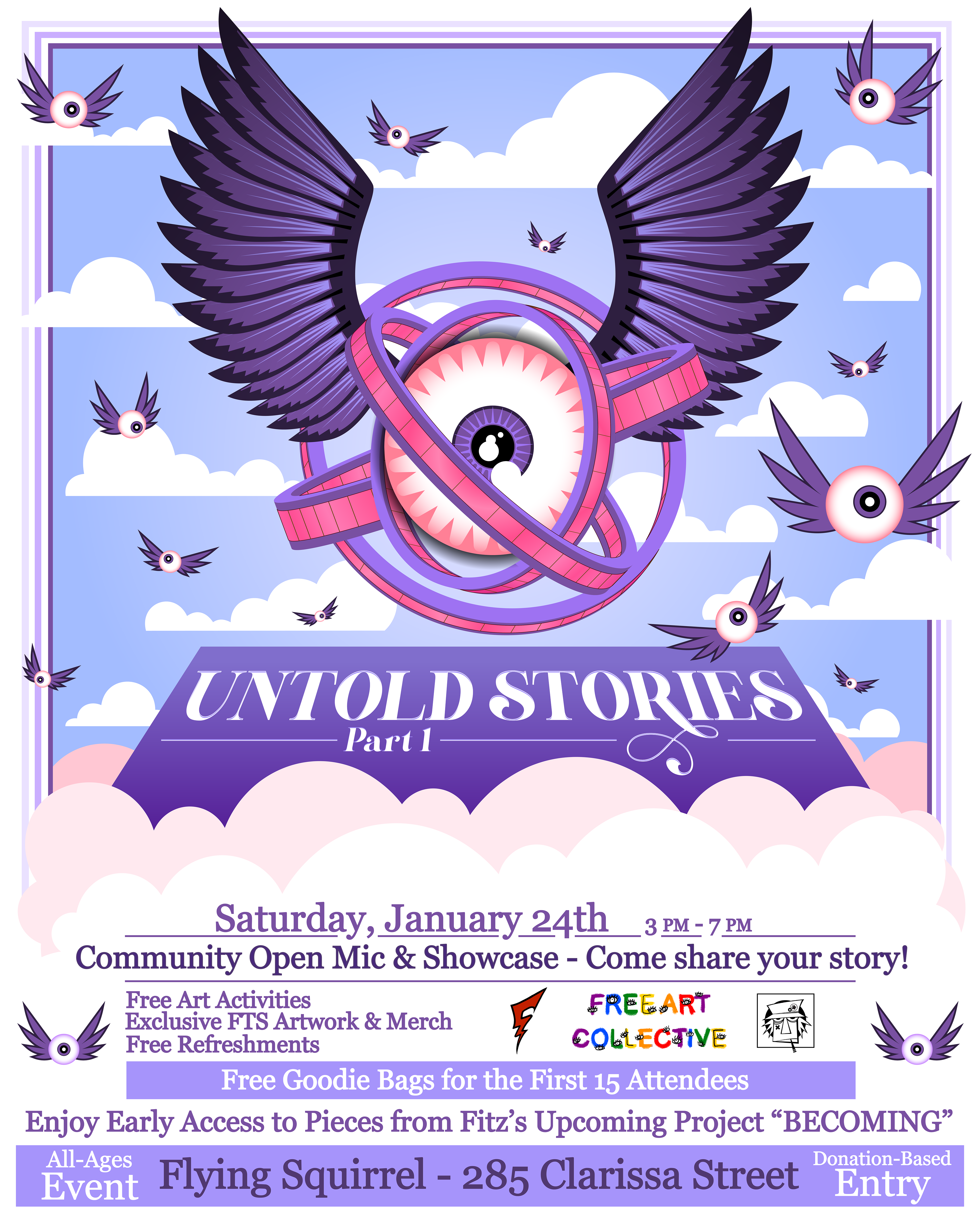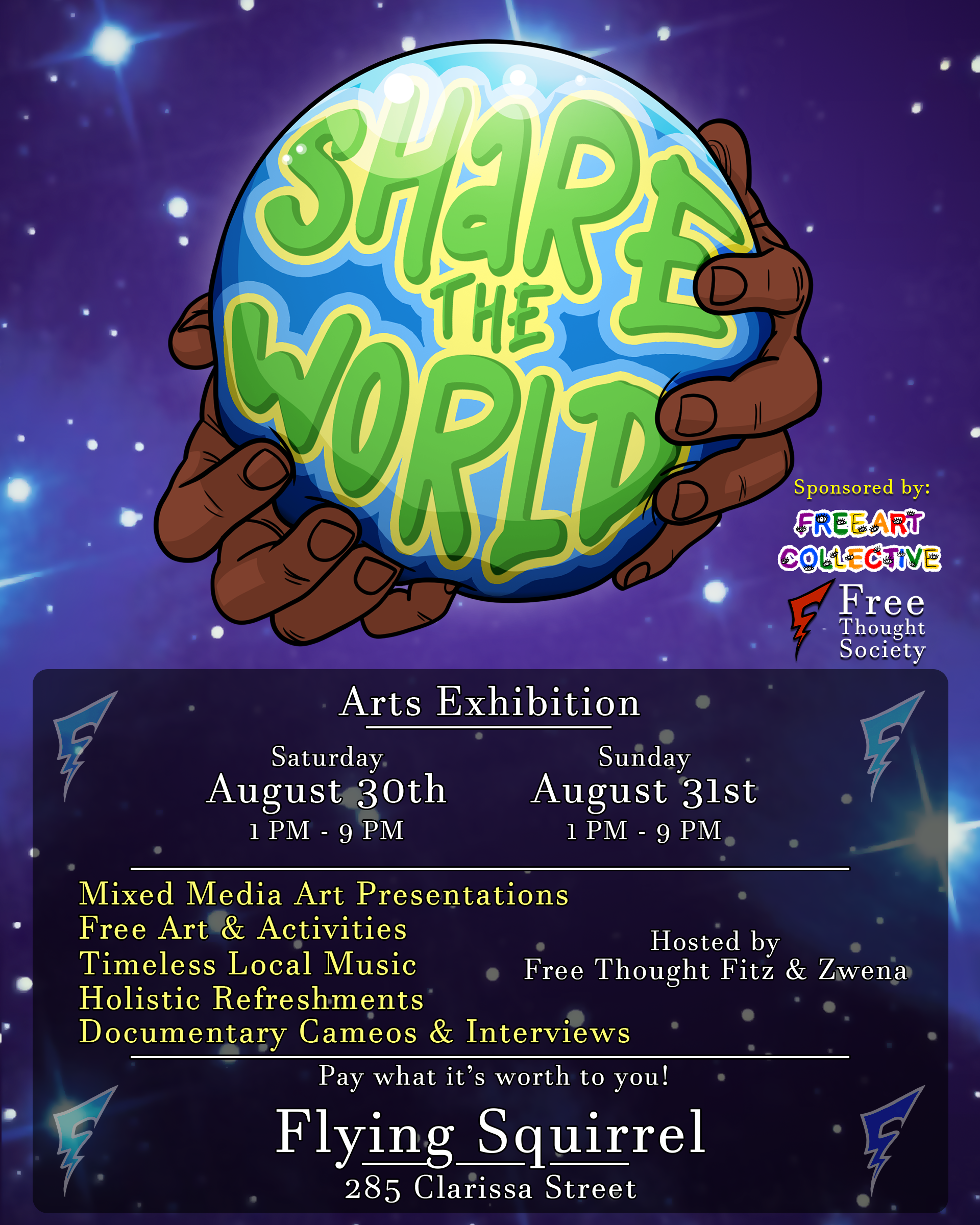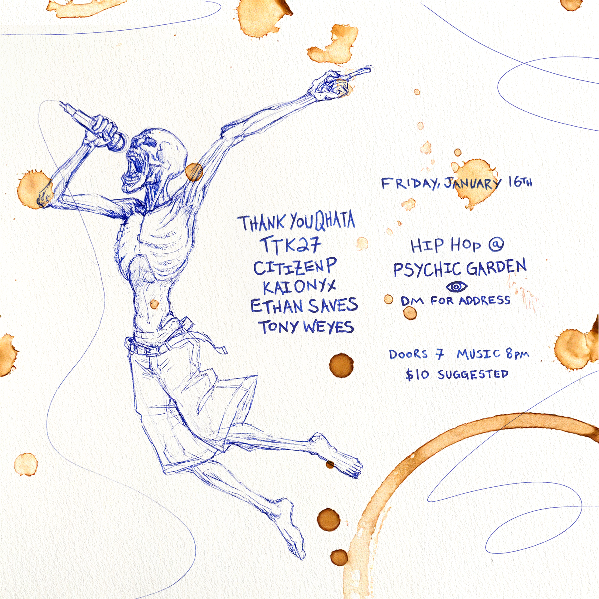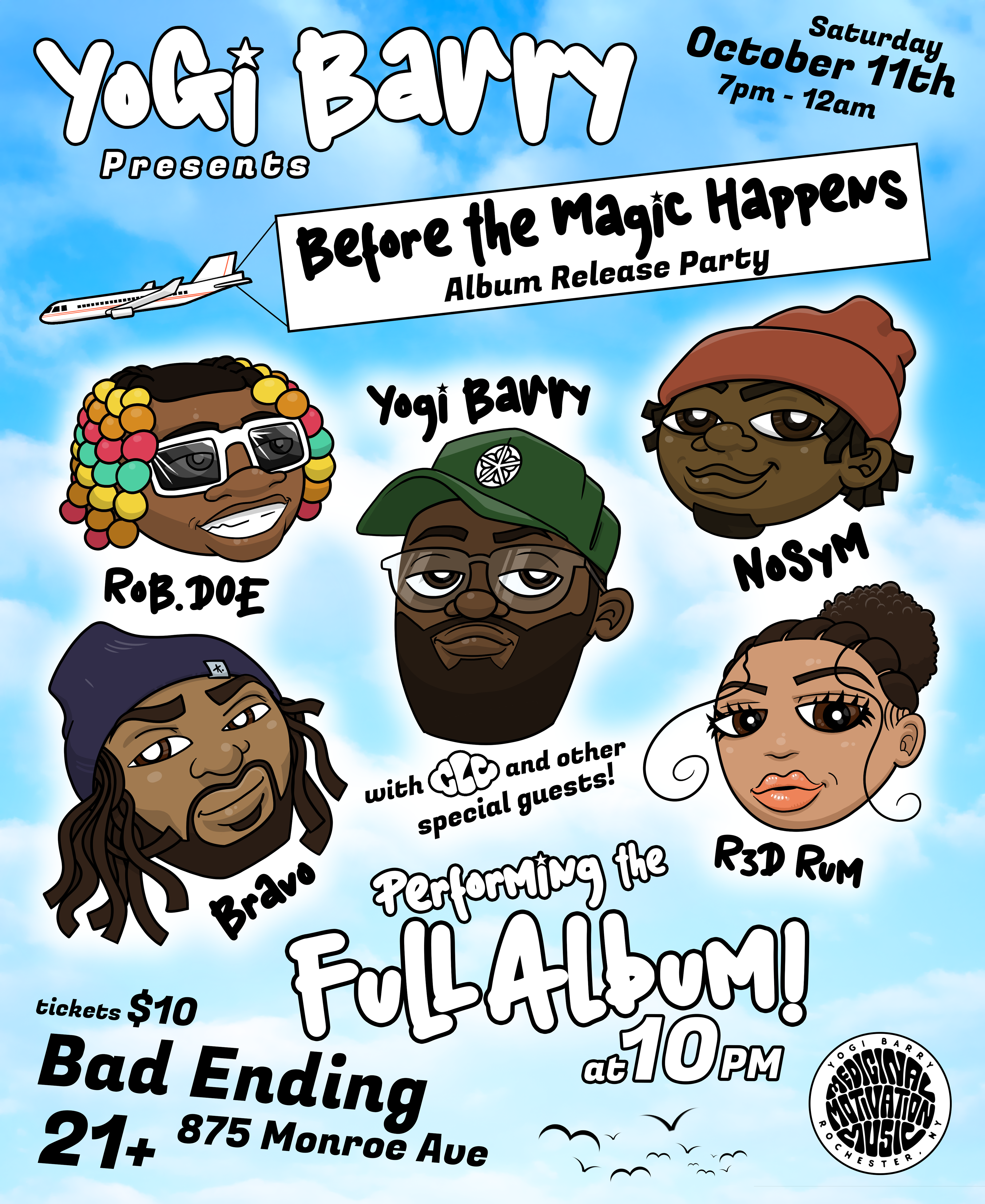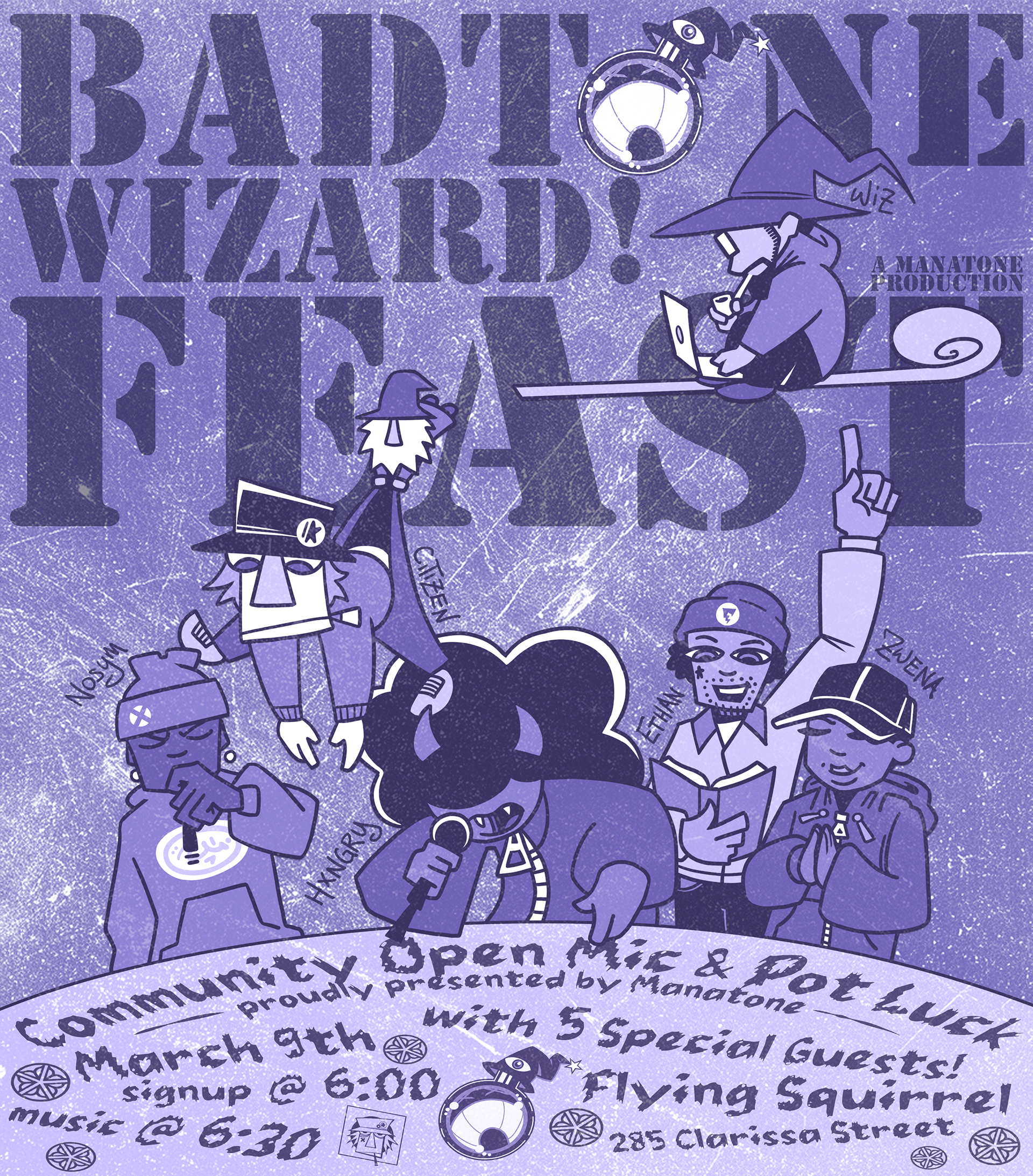 Zane is deeply invested in the Rochester music scene, especially the vibrant local hip-hop collectives in their area. Much of their static design work revolves around cover art, show promotion, and logo design for musicians, which they create to support the wider proliferation of Rochester music.